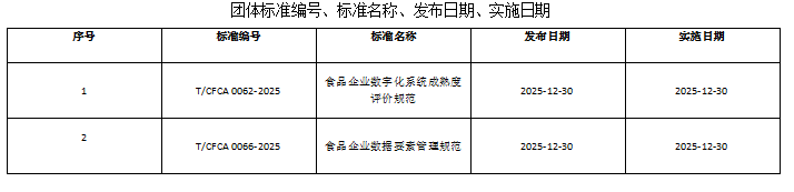 根据《中华人民共和国标准化法》、《关于深化标准化工作改革方案》(国发〔2015〕13号)、《团体标准管理规定(试行)》(国质检标联〔2017〕536号)的相关要求,依照《中国副食流通协会团体标准管理办法(试行)》,现批准《食品企业数字化系统成熟度评价规范》《食品企业数据要素管理规范》两项团体标准(标准编号、标准名称、发布日期、实施日期见附件)于2025年12月30日发布,自发布之日起实施,现予以公布。